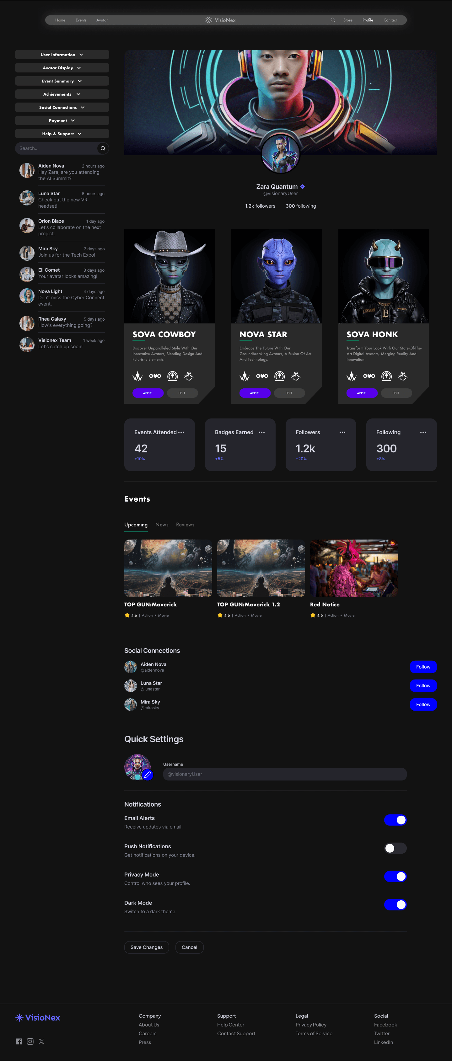 The Visionex User Flow is designed for a seamless and immersive experience, guiding users from profile creation and event discovery to avatar customization, social interactions, and purchasing digital assets.